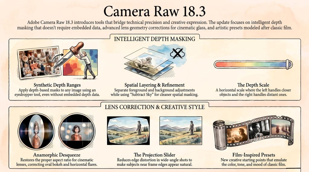 The provided text outlines the sophisticated updates introduced in Adobe Camera Raw 18.3, focusing on tools that refine both technical accuracy and creative expression. A primary highlight is the depth range masking feature, which now allows editors to apply targeted adjustments based on spatial distance even without pre-existing depth data.