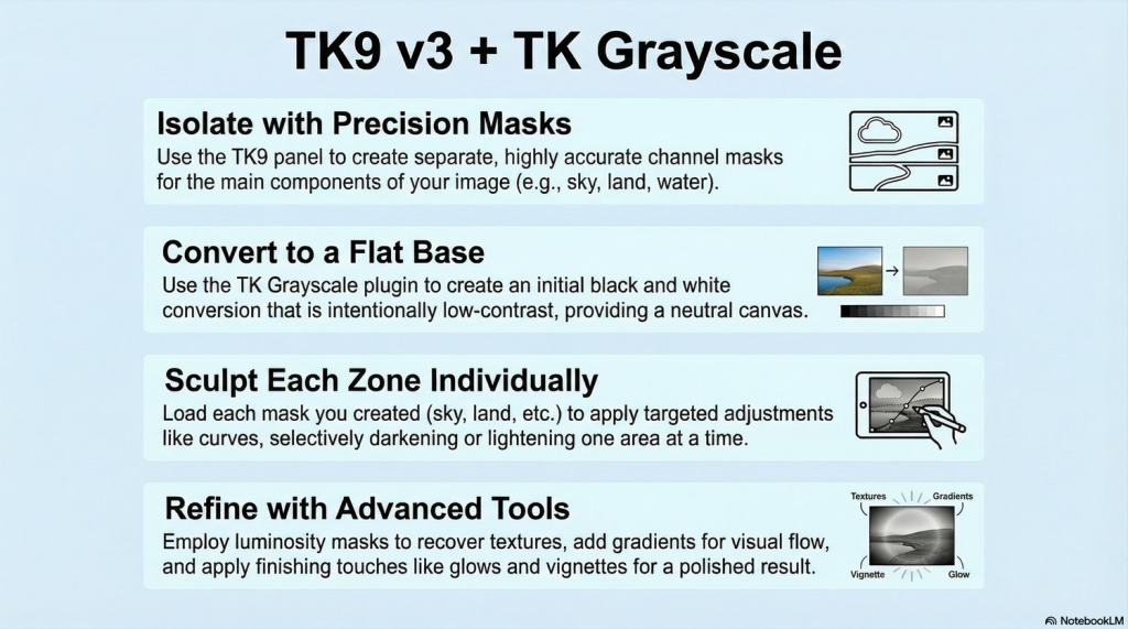 Nikoruato’s tutorial offers a detailed, step-by-step guide to creating compelling black and white landscape images using advanced masking and tonal control techniques. By combining the TK Grayscale plug-in’s ease with the precision of TK9 luminosity masks, photographers can transform ordinary shots into fine art.