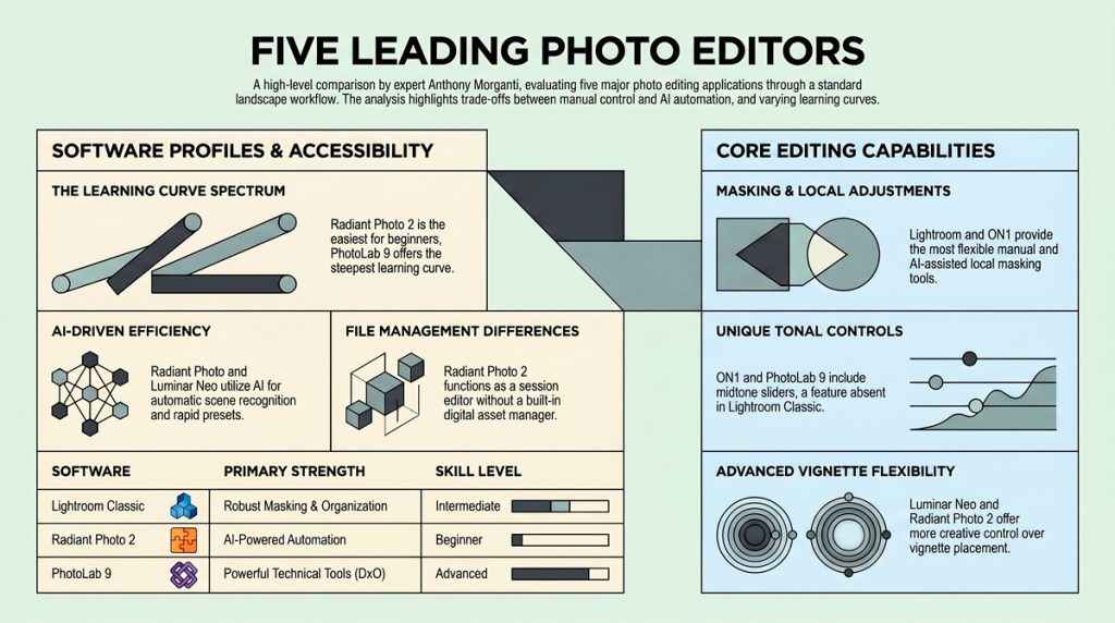 This post outlines a comparative analysis by Anthony Morganti, demonstrating his photo editing workflow across five distinct software applications – Lightroom Classic, Luminar Neo, ON1 Photo RAW, PhotoLab 9, and Radiant Photo 2 to highlight their unique strengths and user interfaces.