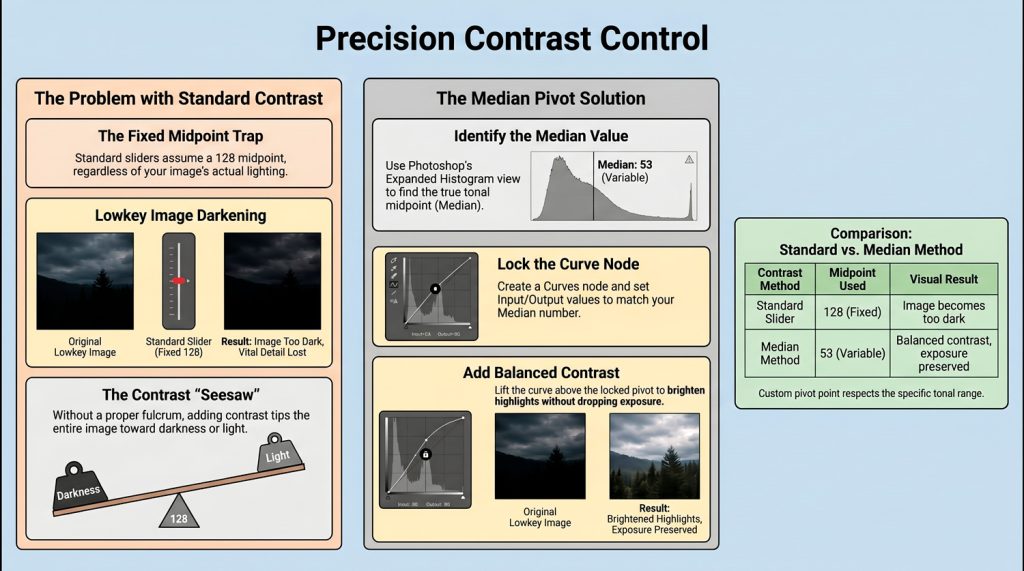 The “128” Default Trap Standard contrast sliders and S-curve presets operate on a fixed technical assumption: that the tonal midpoint of every image is 128 (the 50% line). In a lowkey image, this “unbalanced” approach is a mathematical disaster; you are essentially manipulating “nothing but air” above the midpoint while collapsing the shadows below it, ruining the intended mood and depth.