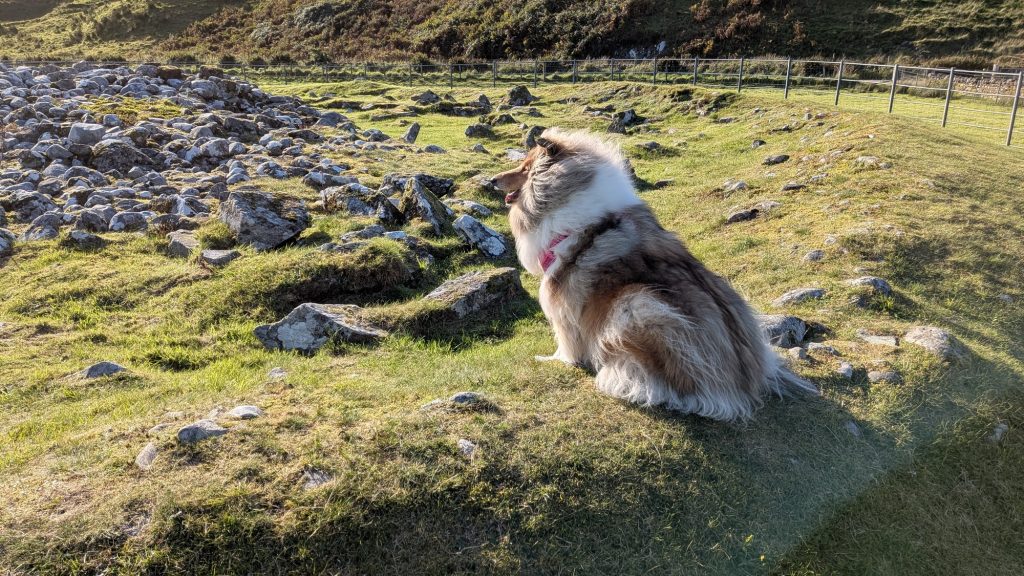 Ronaigh here – Just back from our first holiday, 4 hours in the car ! But, look at all these lovely stones – my humans tell me they are called a Cairn and people were buried there – hmmmm all I can see is a great pile of stones, no bones !