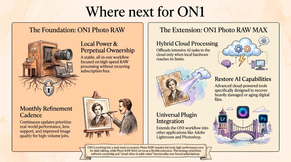 The Hybrid Power Play: Local vs. Cloud – ON1 utilizes a “local when it works best, cloud when it adds value” strategy. While Photo RAW remains the local foundation for image processing, the MAX version leverages cloud power for hardware-intensive tasks like the new Restore AI. This matters because it allows photographers to access advanced AI results that exceed standard hardware limitations without requiring pro-grade local processing power to handle the heavy lifting.
