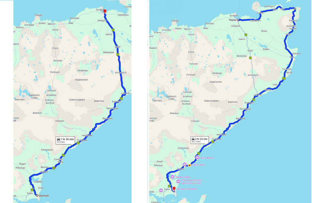 - Distance and Time: The direct drive from Thurso to Dornoch is approximately 69-70 miles and takes around 1 hour and 30 to 45 minutes without any stops, going via John O’ Groats will add about 30-45 minutes of driving time not counting any time you spend stopping to explore and roughly 35-40 miles to your journey.