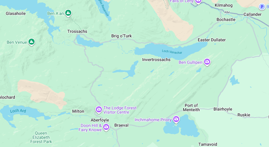 - Start at Callander → take the A84/A821 (Kilmahog) up the Duke’s Pass to Aberfoyle → continue to Brig o’ Turk.